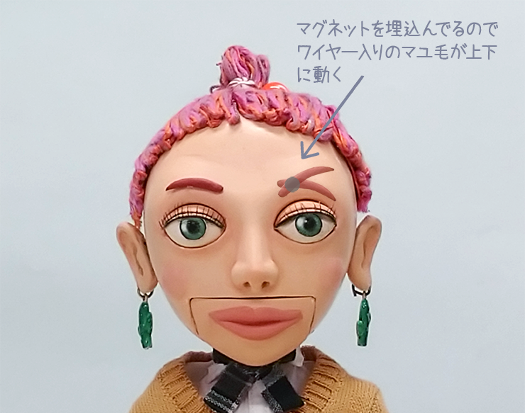 これも多分オリジナル技法になると思いますが、私はマユ毛を動かすために、マグネットを目の上部分に埋め込んでいます。マユ毛本体には金属(鉄製ワイヤー)を仕込んでいるので、上下の動きが可能になります。